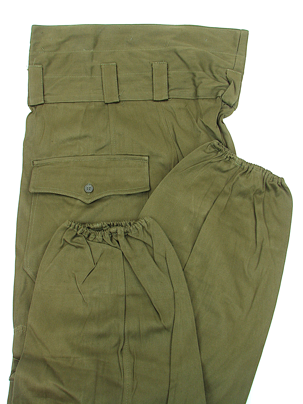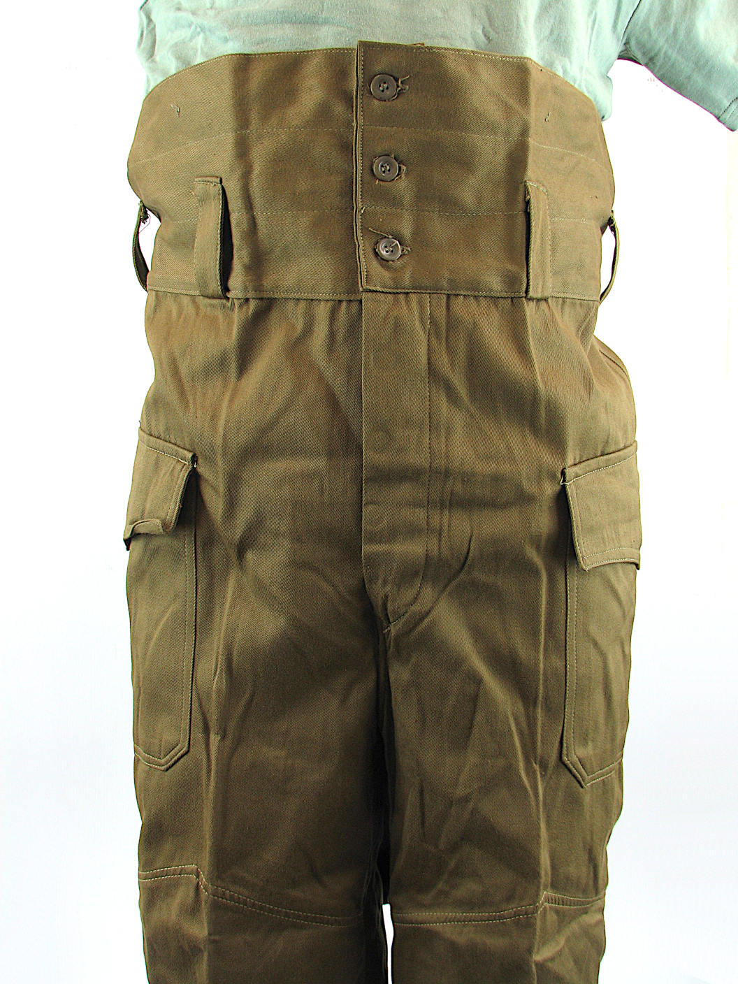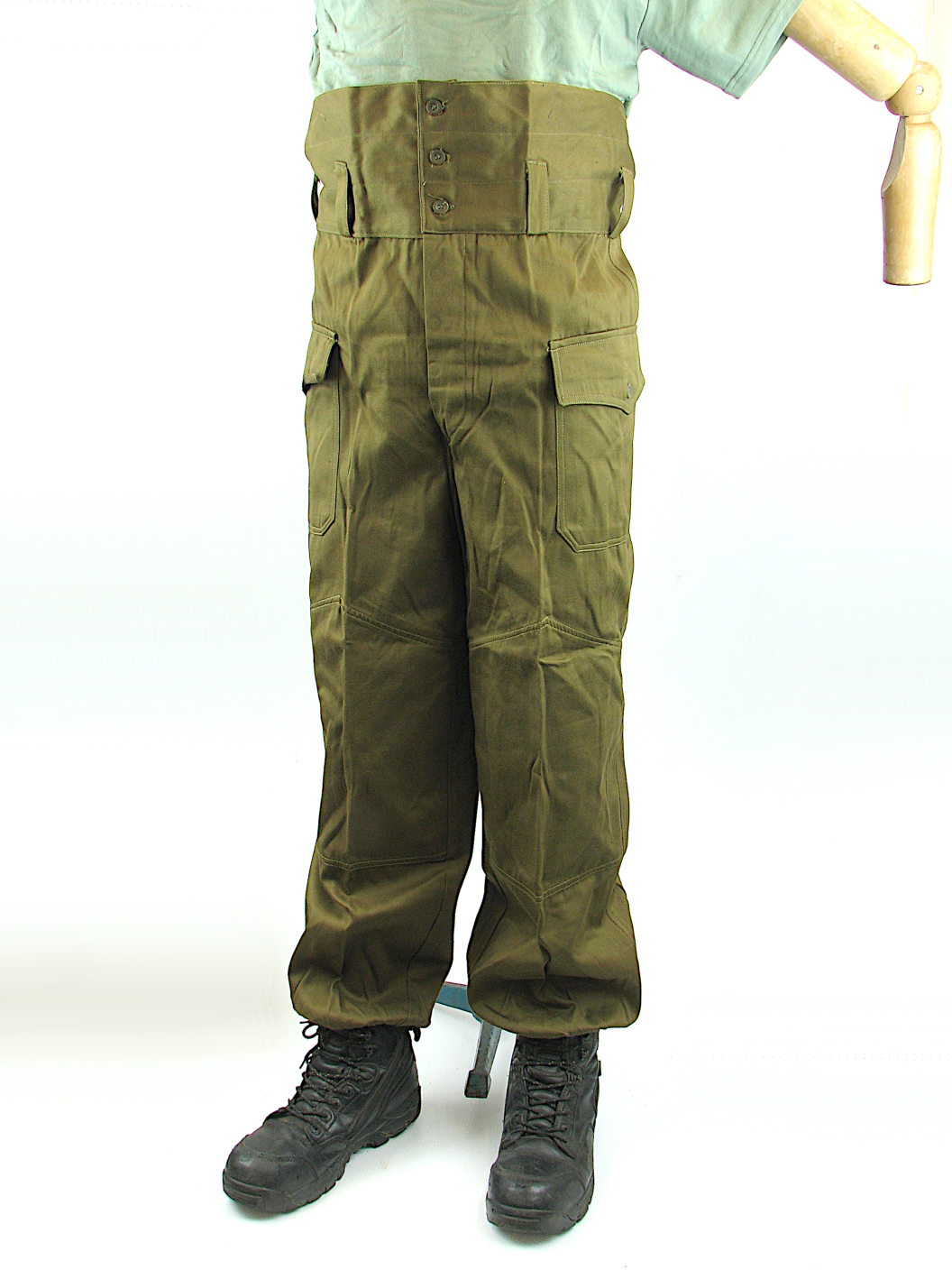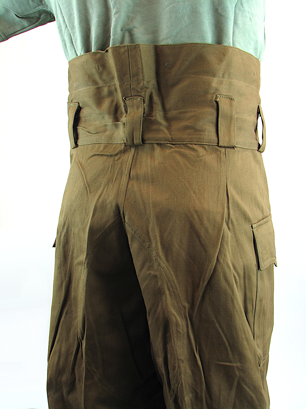 These trousers hail from Bulgaria and as they date from the early 90s they show a new look for the post-Communist Bulgarian Army as they moved on from breeches and jackboots. Made from a drab green/brown cotton drill material, they feature firstly a very high waist with big 6cm belt loops which actually is very good for keeping you warm around the midriff. There are double layer reinforced knees and seat and the leg cuffs are elasticated. There is a button fly with internal waistband buttons for braces and the only pockets are the two large ones on each upper leg.Available in waist sizes 92cm, 96cm and 100cm.