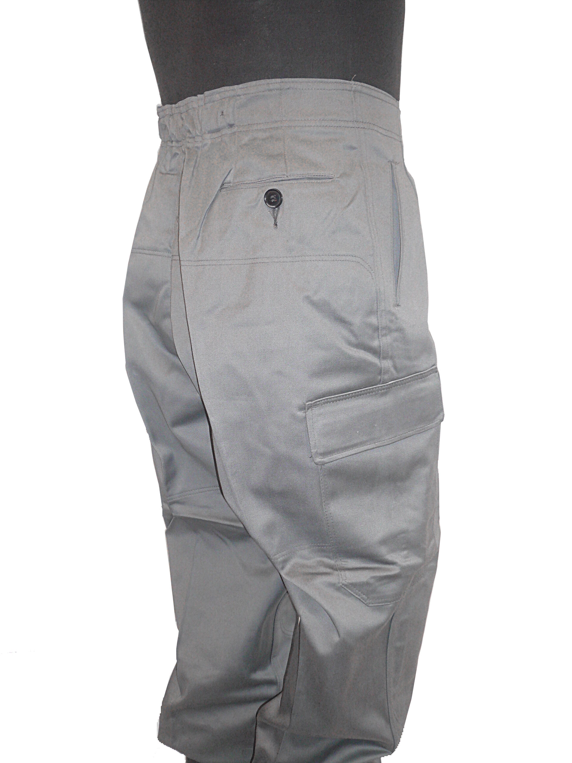 Made for female personnel of the Danish Civil Defence,or ‘Civilforsvaret’,these heavy weight cotton drill trousers are built tough like military pants and would be a great choice for motorcycling,farm work,the outdoors or any activity requiring hardwearing pants.They feature a side zip and button closure with an elastic waist,two side slash pockets,two velcro leg pockets,and a button pocket on the right hip.The seat and knees are double layer reinforced and the trouser cuffs can be bloused with draw cords.They are available in these three waist sizes: