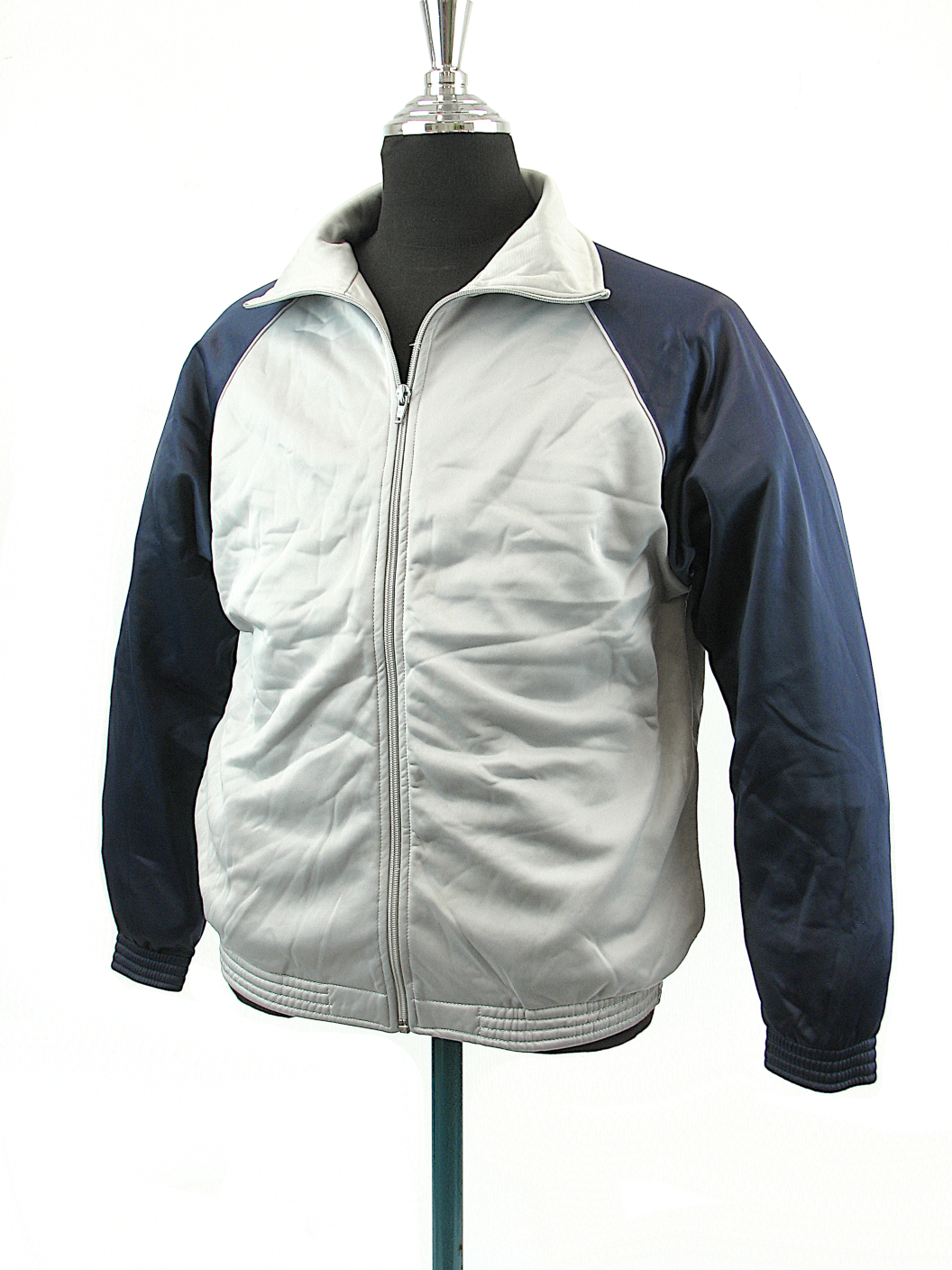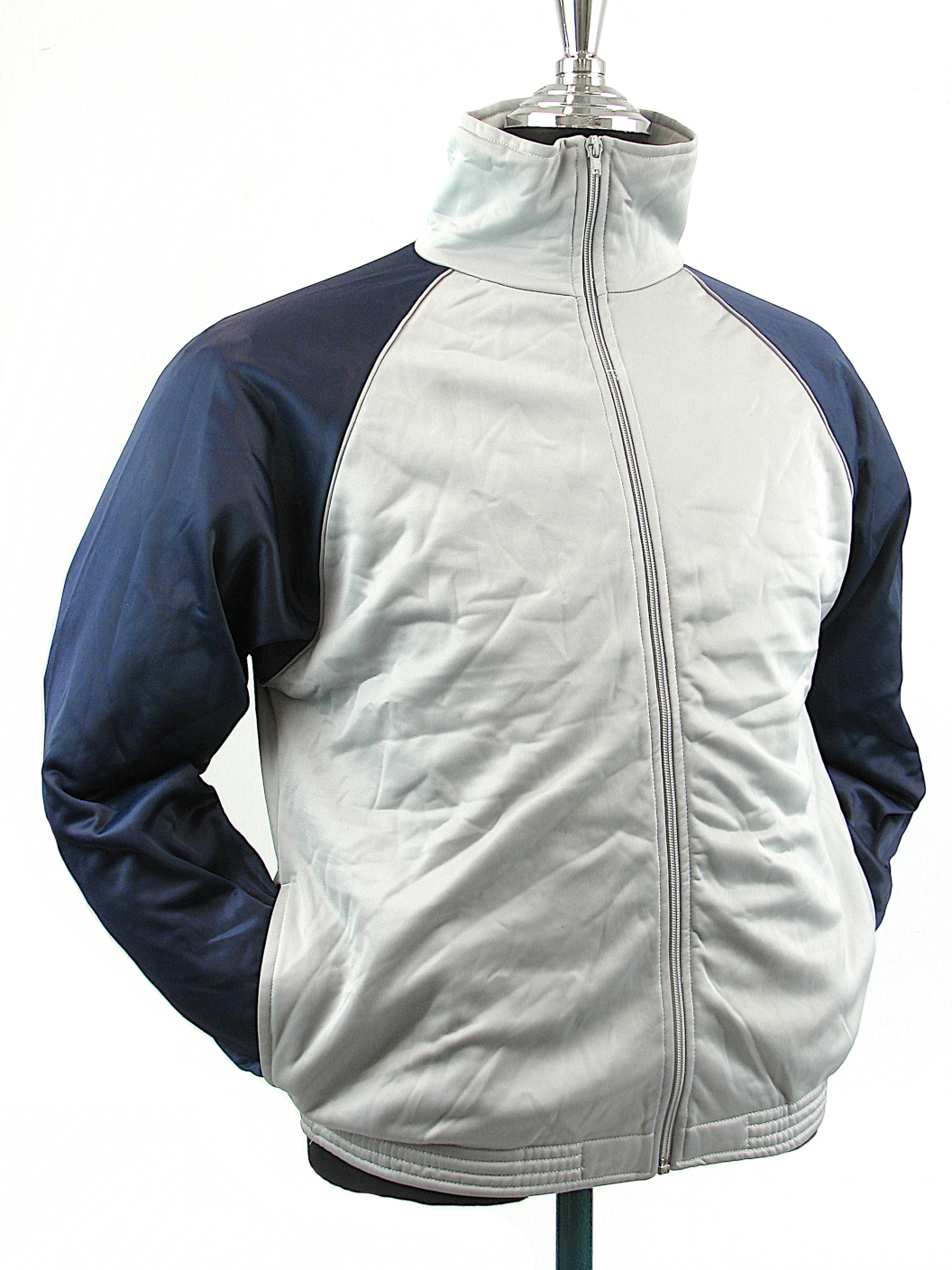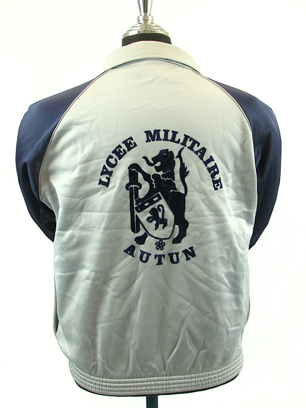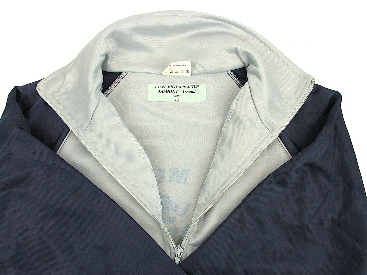 These Grey/Navy Blue zip jacket were worn by pupils at the French Military School in the town of Autun. Made from 100% Polyester they feature a fleecy lining, elasticated cuffs and waist and two waist pockets, just like a regular track suit top.Available in standard S, M, L & XL sizes.