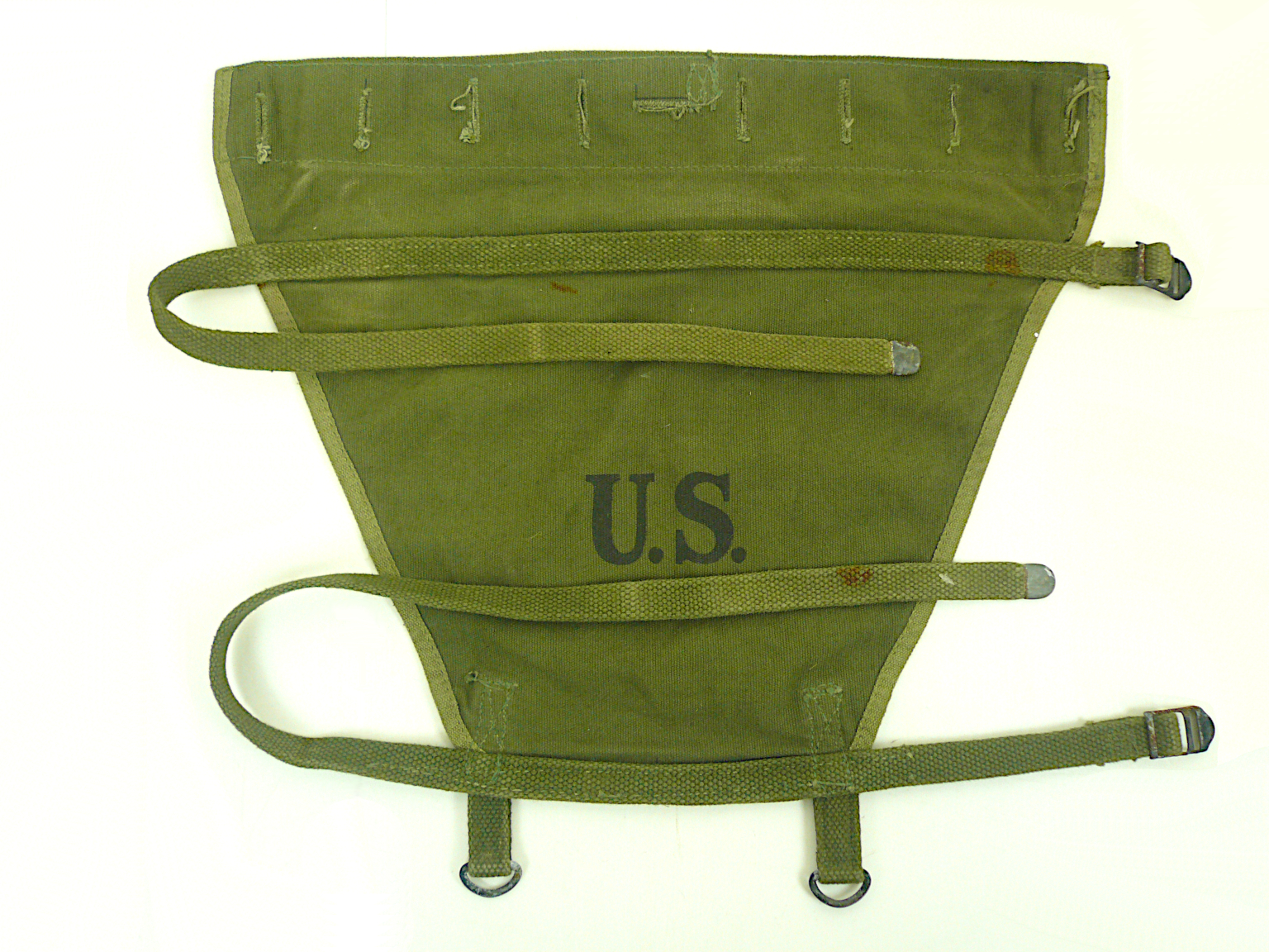 This is the extra piece of canvas that attached to the bottom edge of the US Army M1928 Haversack and increased its carrying capacity.This example was made by Bruce & Thomas Mfg Co in 1944 and is in OD No7 shade.There is some slight corrosion/rust on some of the metal fixtures however overall it is in good condition. Note – the leather insert strap is still required to attach this to the pack.