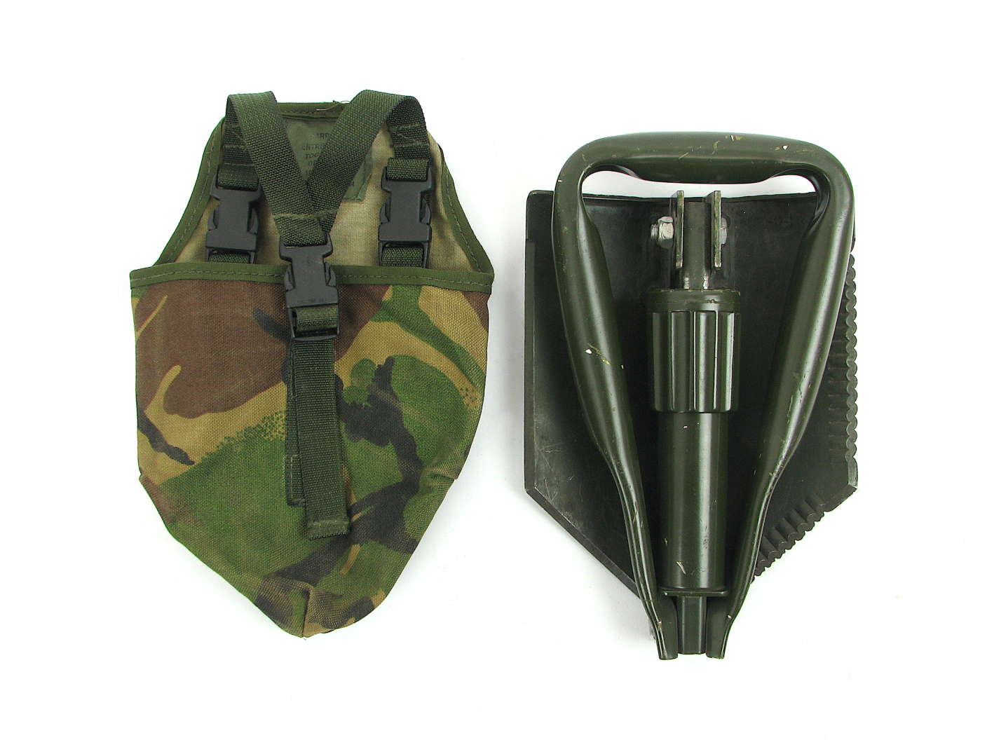 Originally designed for the US Army in the 80’s, this classic design has become the NATO standard for digging implements. As the name suggests the shovel folds into three by unscrewing the threaded sleeve at the base of the blade and this also enables it to be positioned at a right angle to use as a grubber. These tools are a mixture of Belgian and German models matched with British DPM covers which can be attached to a belt. They are used/ex- Military so will have the usual marks and scratches etc but being such a rugged design they are still fit for use and have many years of life left in them.